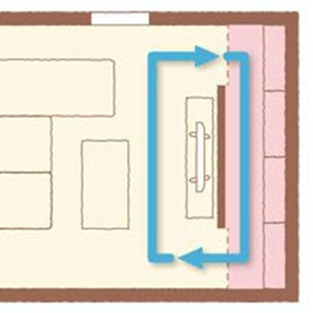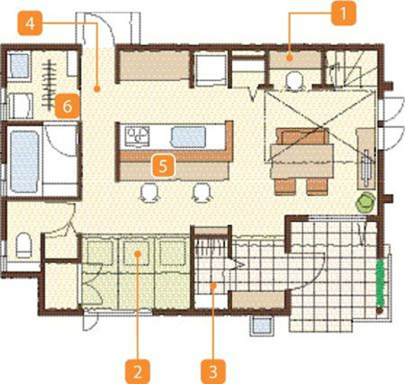 這個(gè)布置適合大玄關(guān)。對(duì)于較小的玄關(guān),有如下方式縮減流線距離,使布局更緊湊。